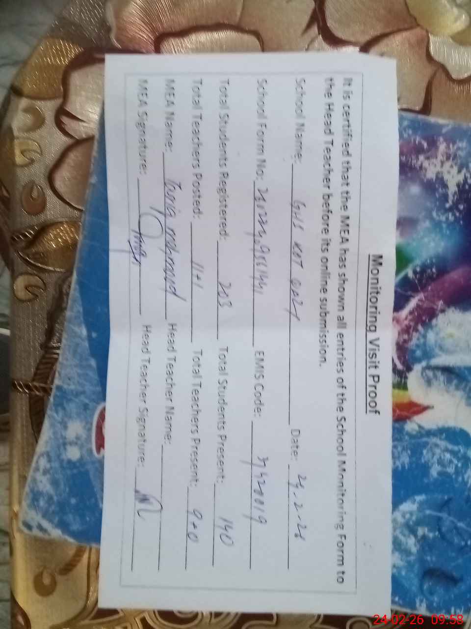 | Attendance Register | Head Teacher | MEA with School | Visit Proof |