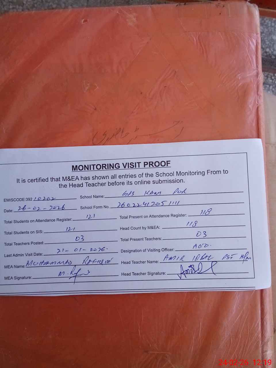 | Attendance Register | Head Teacher | MEA with School | Visit Proof |