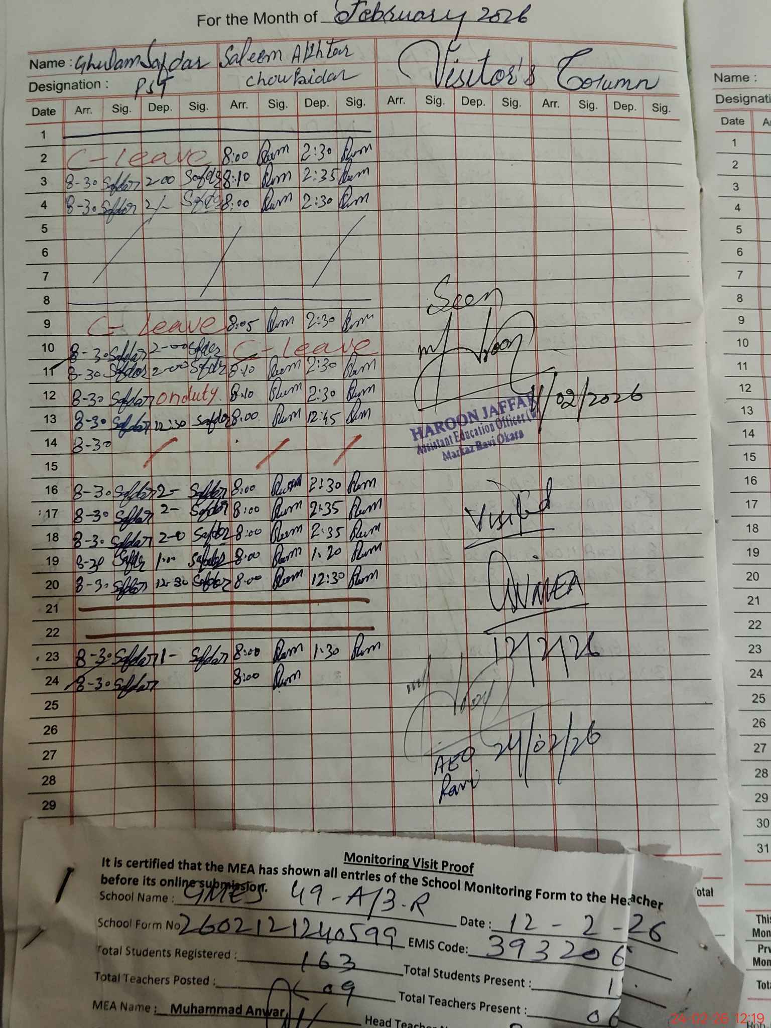 | Attendance Register | Head Teacher | MEA with School | Visit Proof |