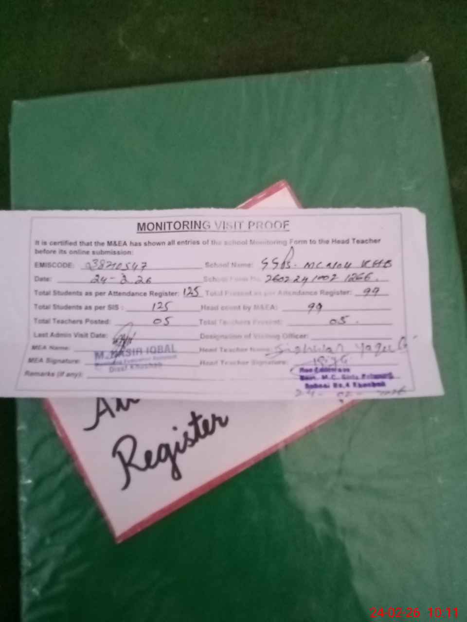| Attendance Register | Head Teacher | MEA with School | Visit Proof |