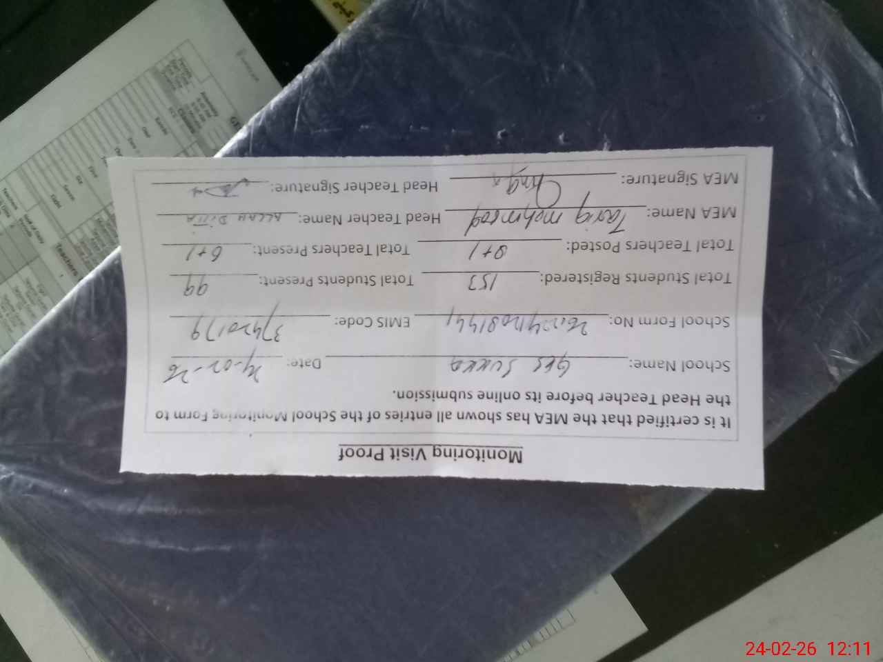 | Attendance Register | Head Teacher | MEA with School | Visit Proof |