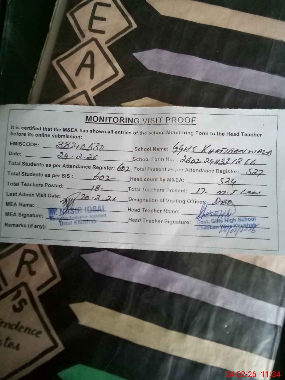 | Attendance Register | Head Teacher | MEA with School | Visit Proof |