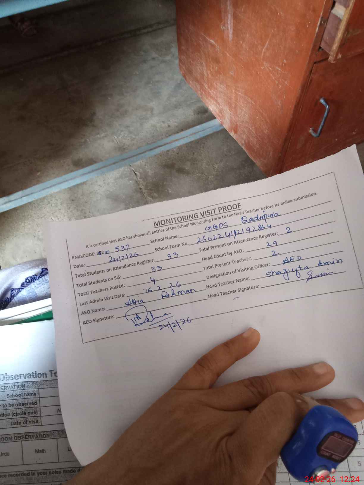 | Attendance Register | Head Teacher | MEA with School | Visit Proof |