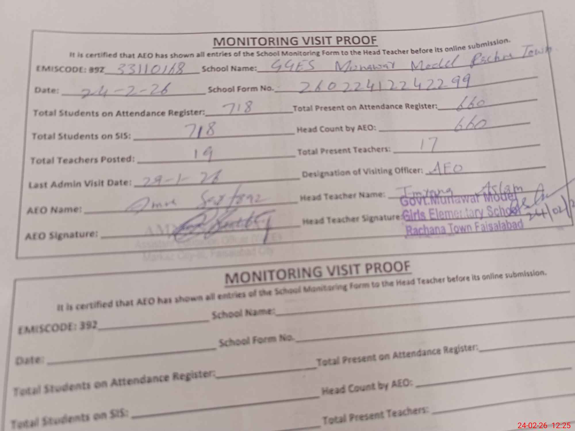 | Attendance Register | Head Teacher | MEA with School | Visit Proof |