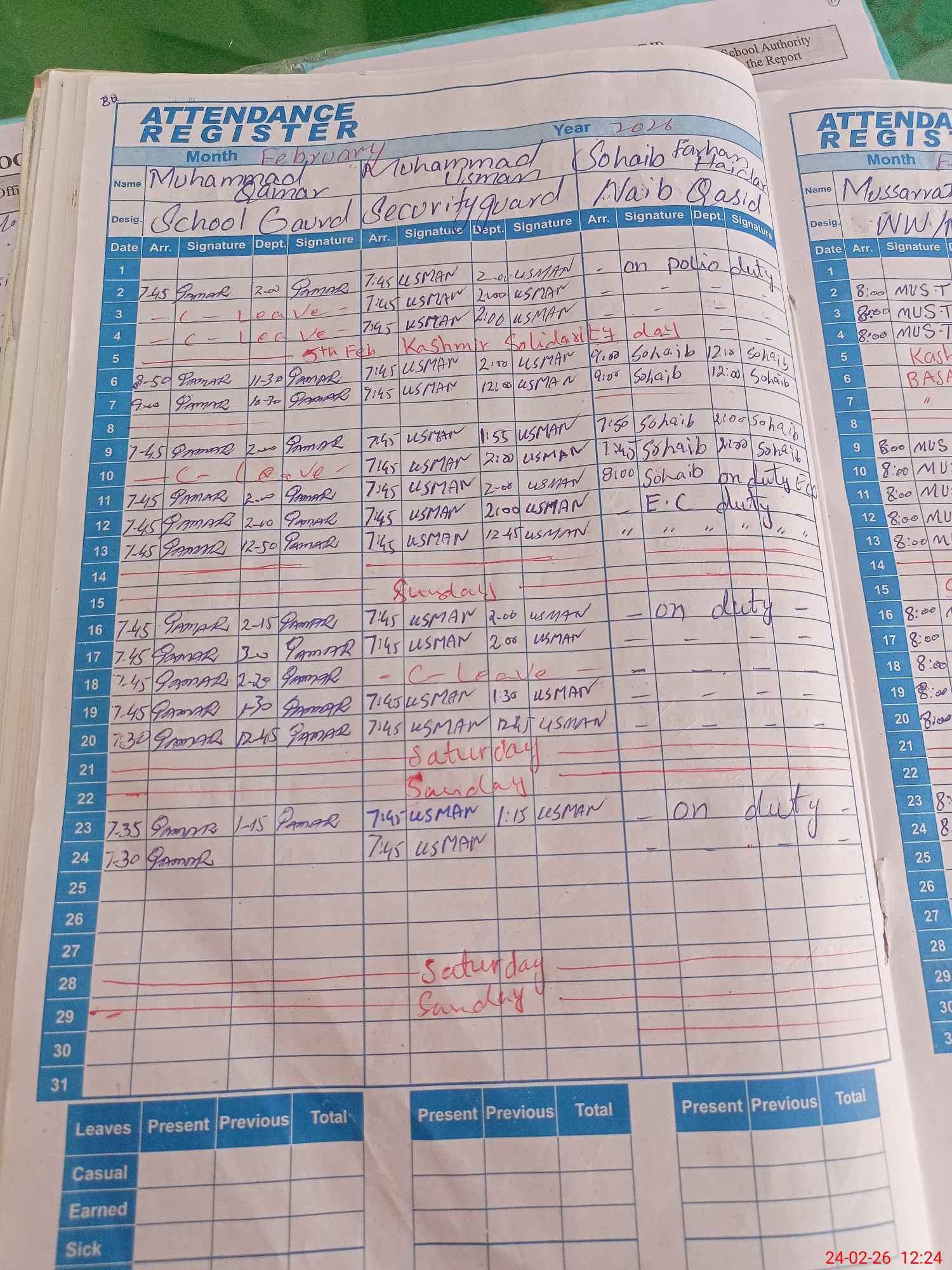 | Leave | Duty | Absent | Maternity | Medical | Ex- Pak |