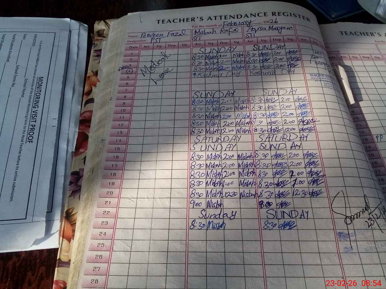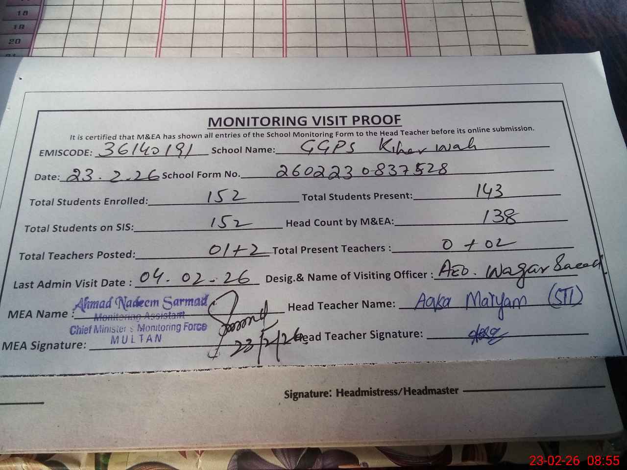 | Attendance Register | Head Teacher | MEA with School | Visit Proof |
