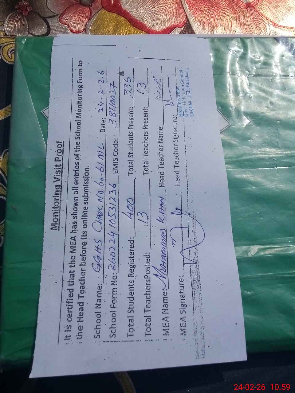 | Certified that this School was Inspected by the Undersigned MEA/DMO Today and the Information Stated Above is as Per Record. | |||||