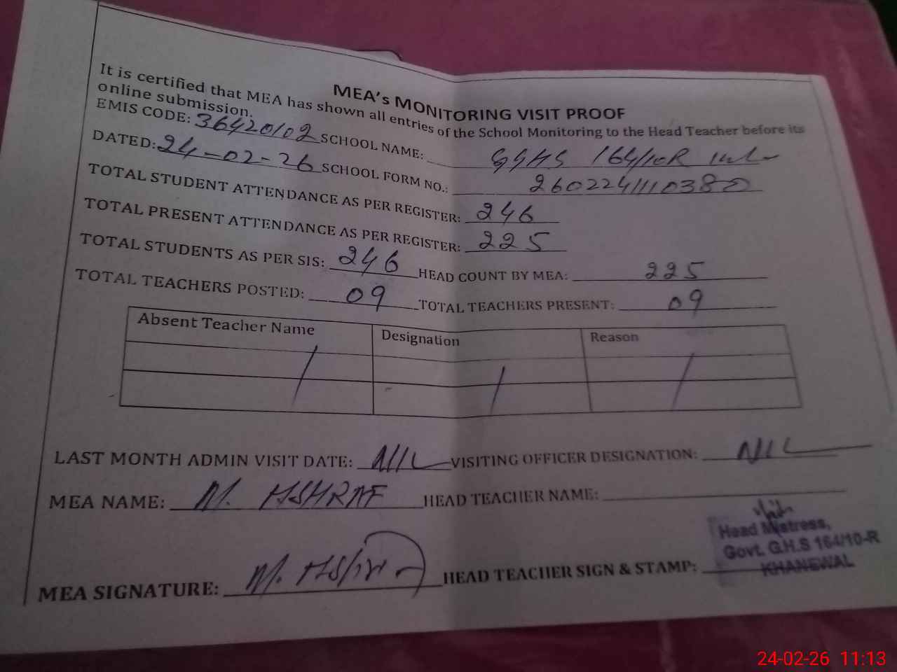 | Attendance Register | Head Teacher | MEA with School | Visit Proof |