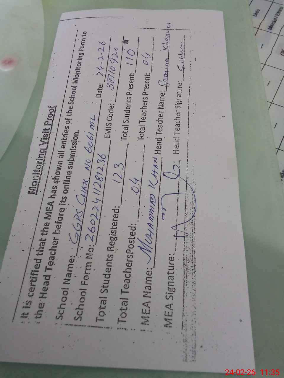 | Attendance Register | Head Teacher | MEA with School | Visit Proof |