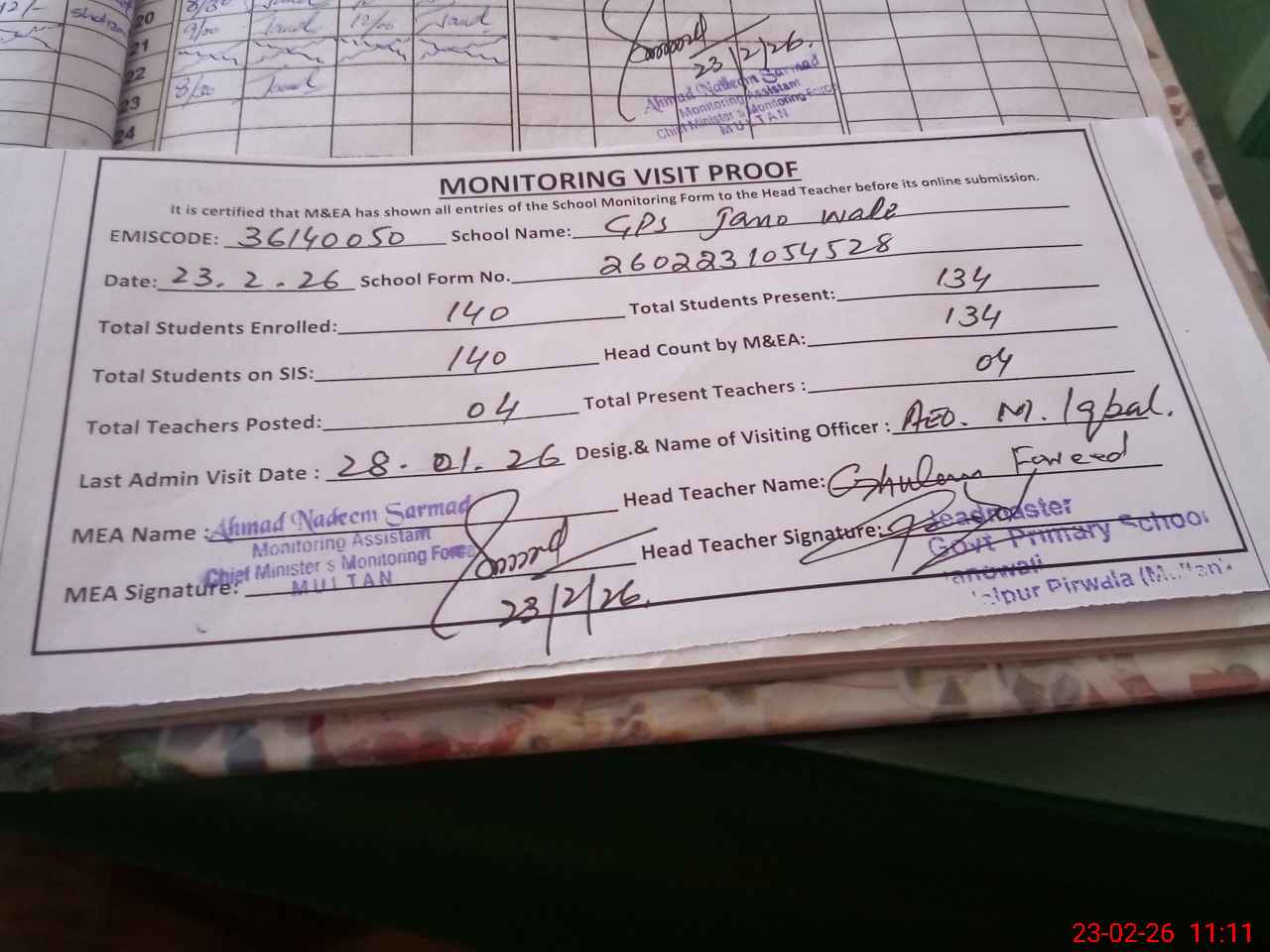 | Attendance Register | Head Teacher | MEA with School | Visit Proof |