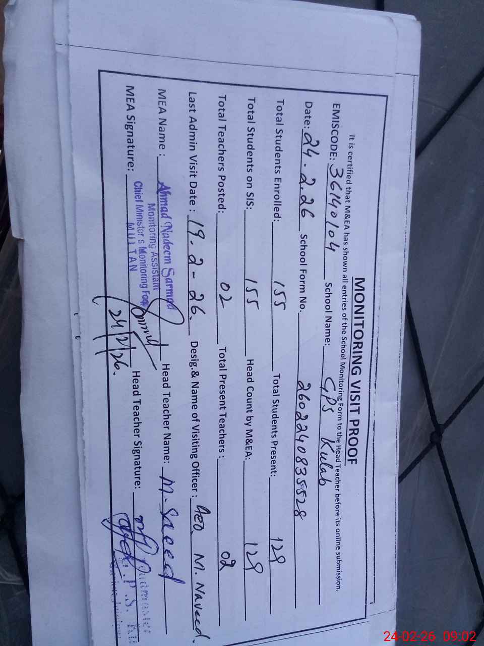 | Attendance Register | Head Teacher | MEA with School | Visit Proof |