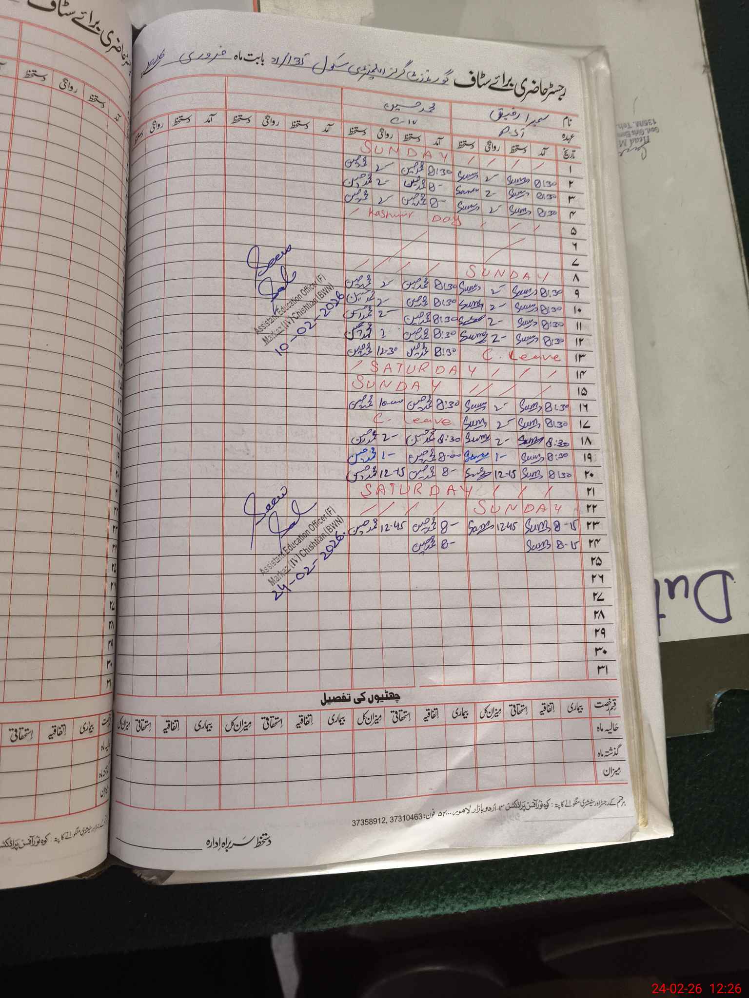 | CNIC | Full Name | Designation | R/C | Absence During Last Calender Month |