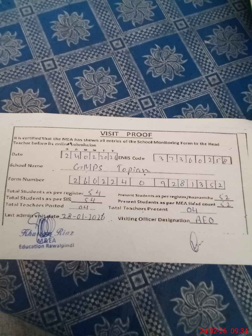 | Certified that this School was Inspected by the Undersigned MEA/DMO Today and the Information Stated Above is as Per Record. | |||||
