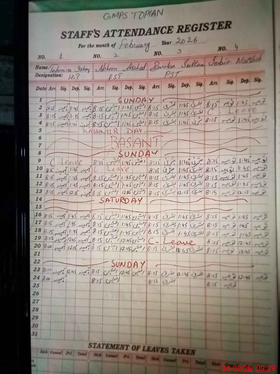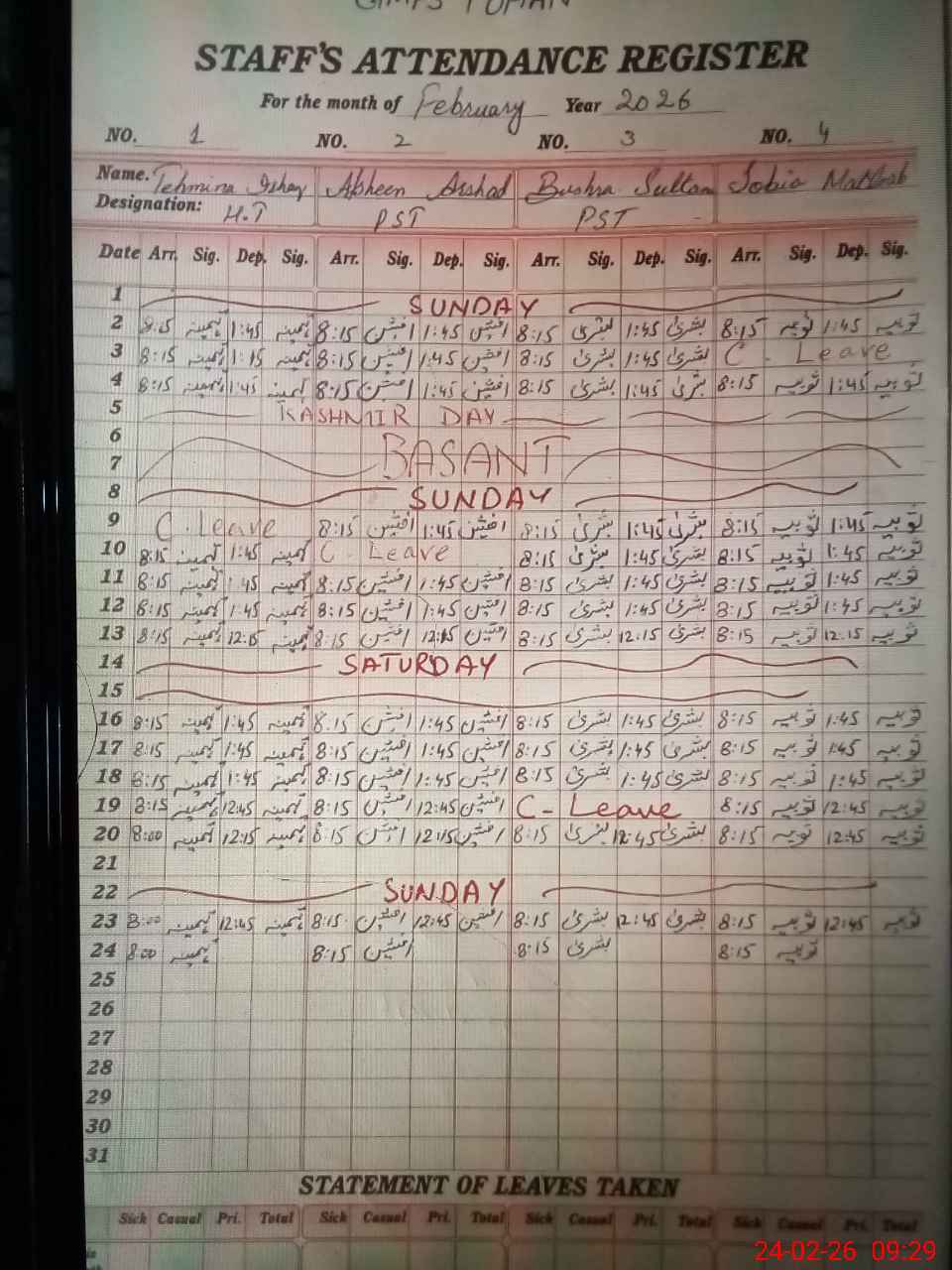 | Leave | Duty | Absent | Maternity | Medical | Ex- Pak |