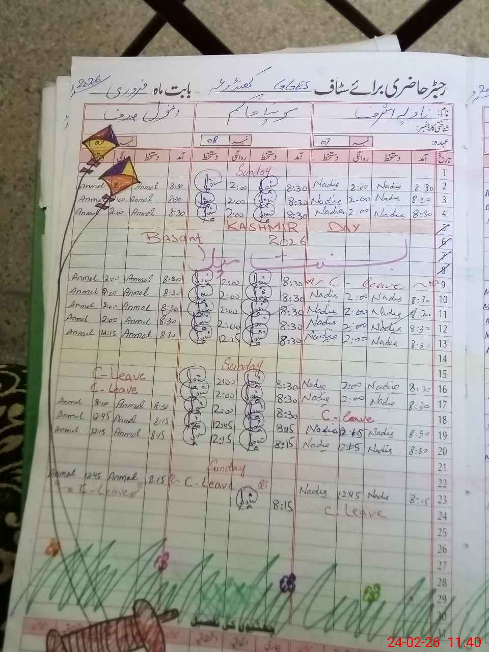 | CNIC | Full Name | Designation | R/C | Absence During Last Calender Month |