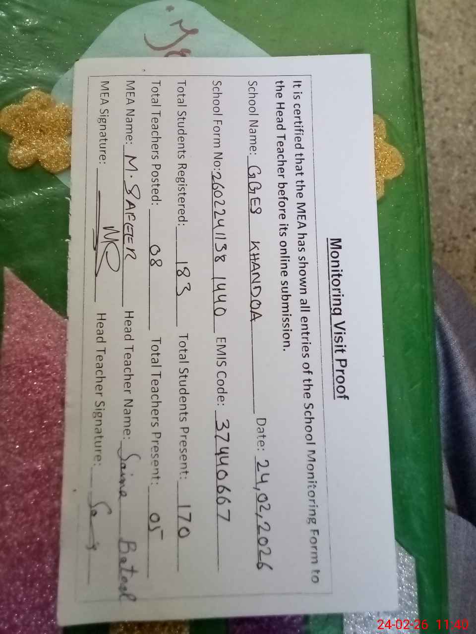 | Certified that this School was Inspected by the Undersigned MEA/DMO Today and the Information Stated Above is as Per Record. | |||||