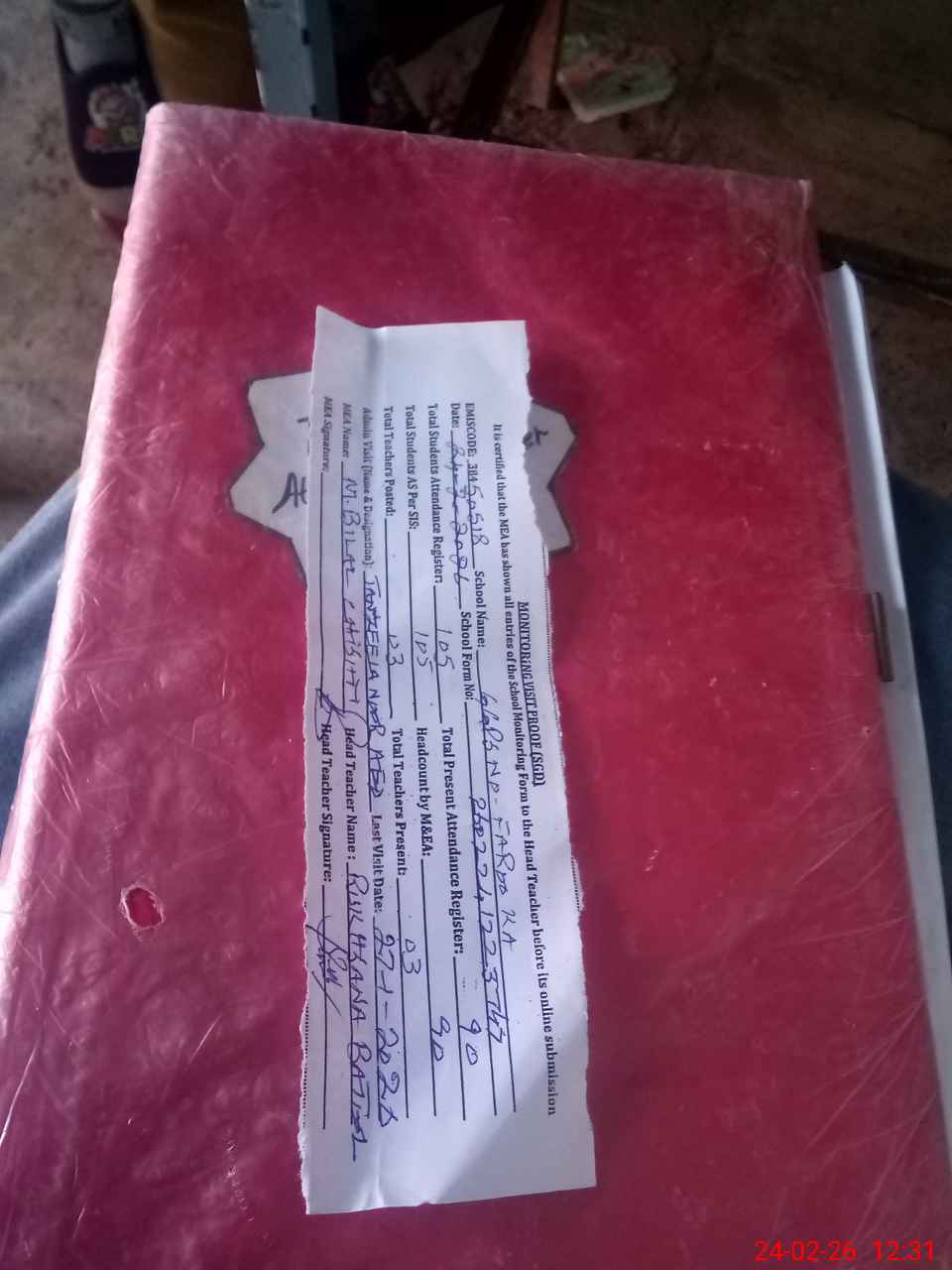 | Attendance Register | Head Teacher | MEA with School | Visit Proof |