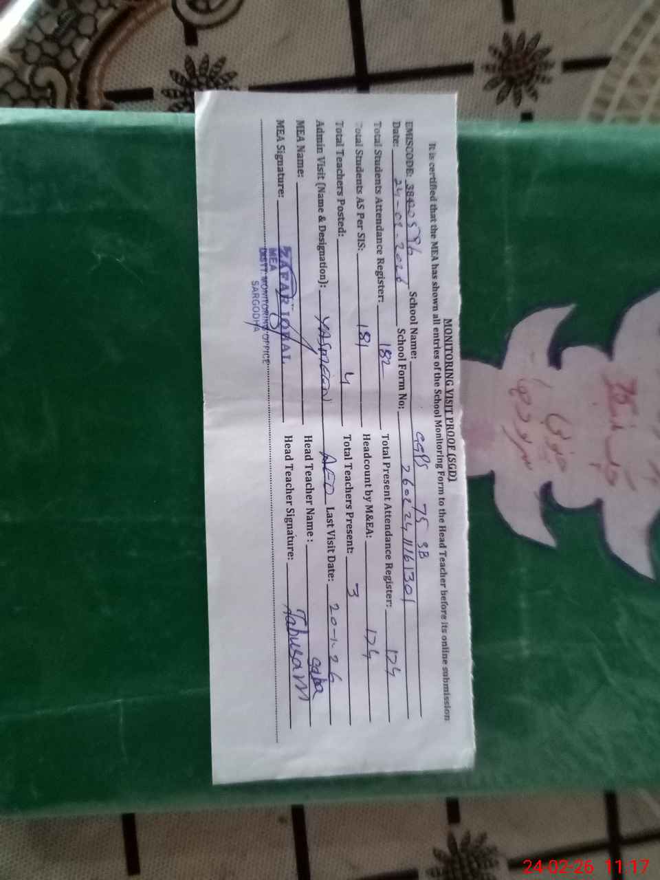 | Attendance Register | Head Teacher | MEA with School | Visit Proof |