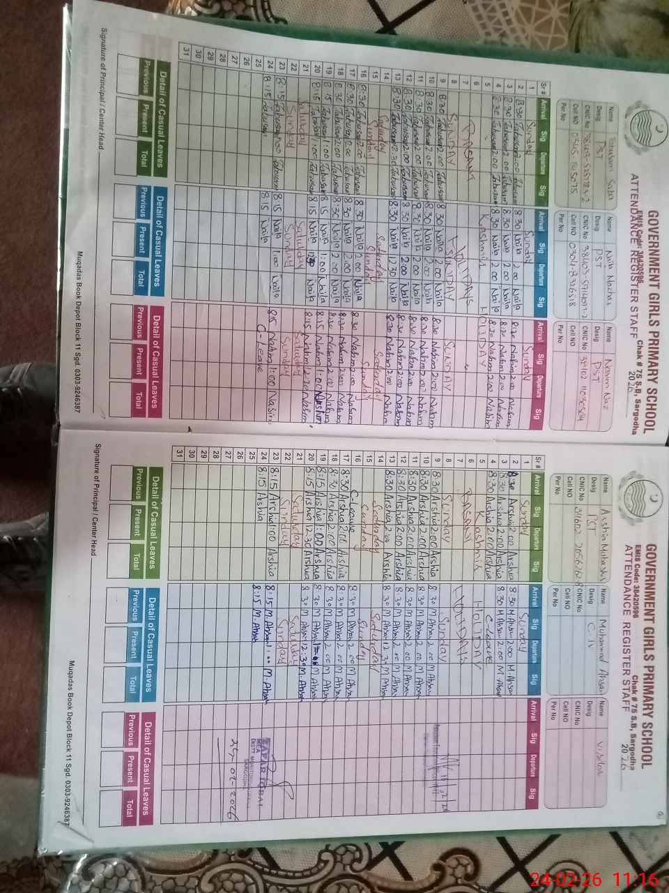 | CNIC | Full Name | Designation | R/C | Absence During Last Calender Month |