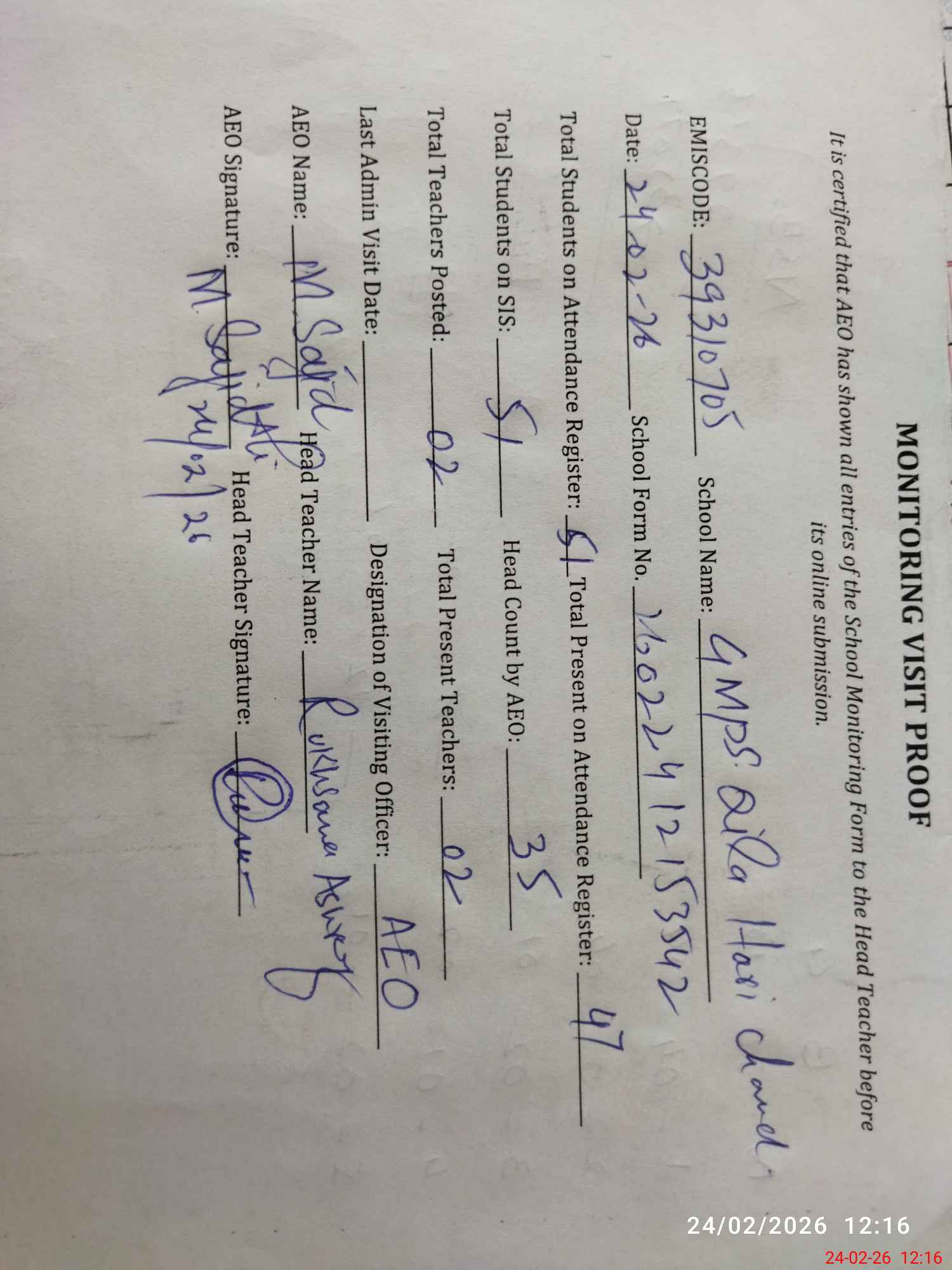 | Attendance Register | Head Teacher | MEA with School | Visit Proof |