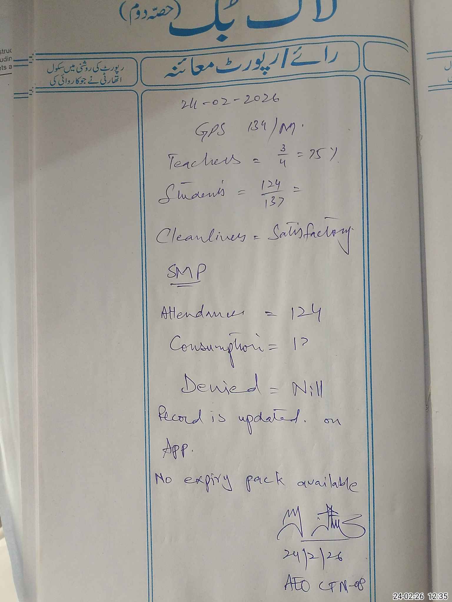 | Certified that this School was Inspected by the Undersigned MEA/DMO Today and the Information Stated Above is as Per Record. | |||||