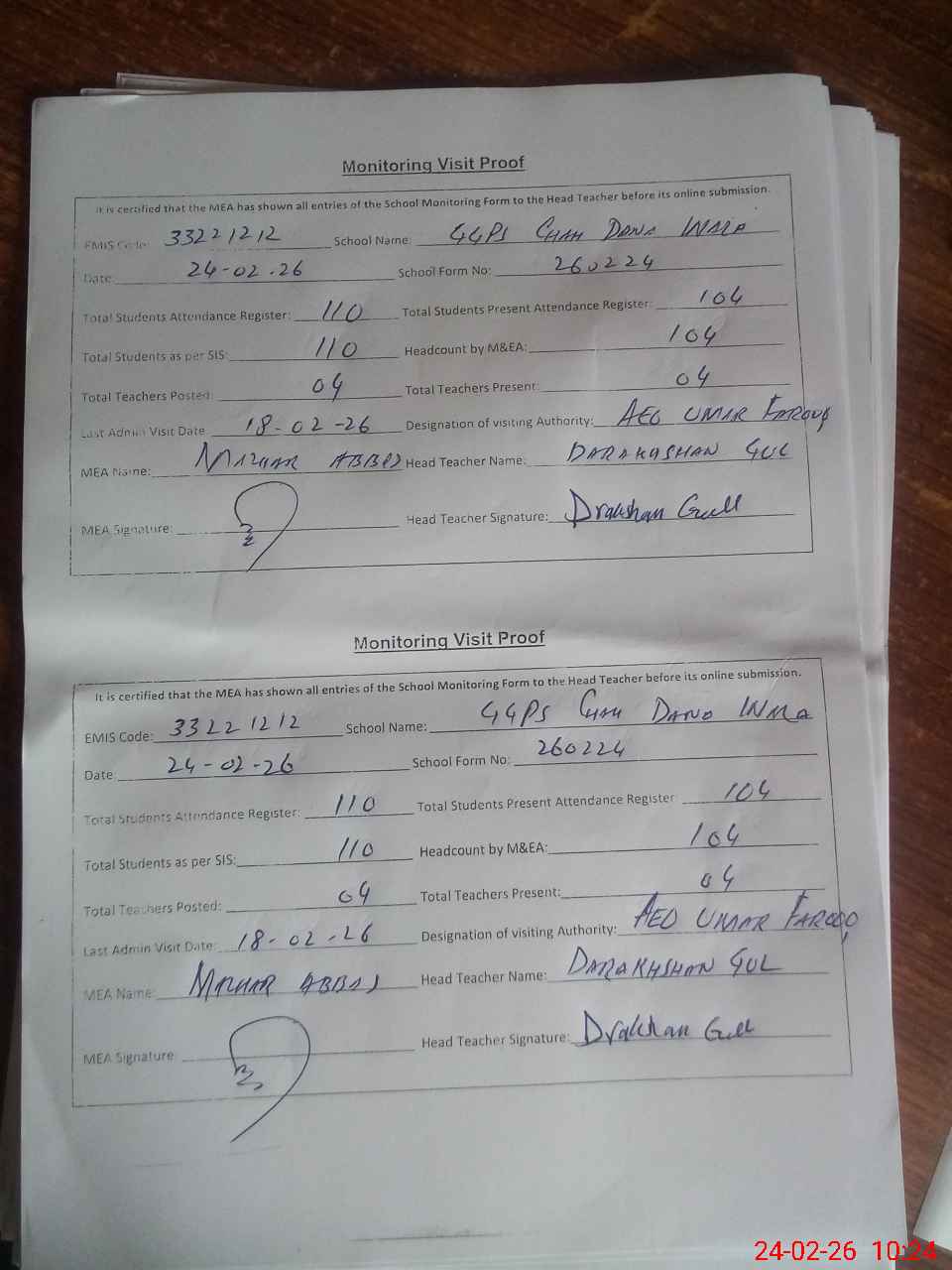 | Attendance Register | Head Teacher | MEA with School | Visit Proof |