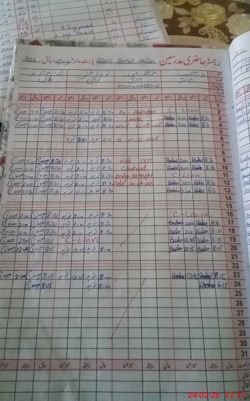 | CNIC | Full Name | Designation | R/C | Absence During Last Calender Month |