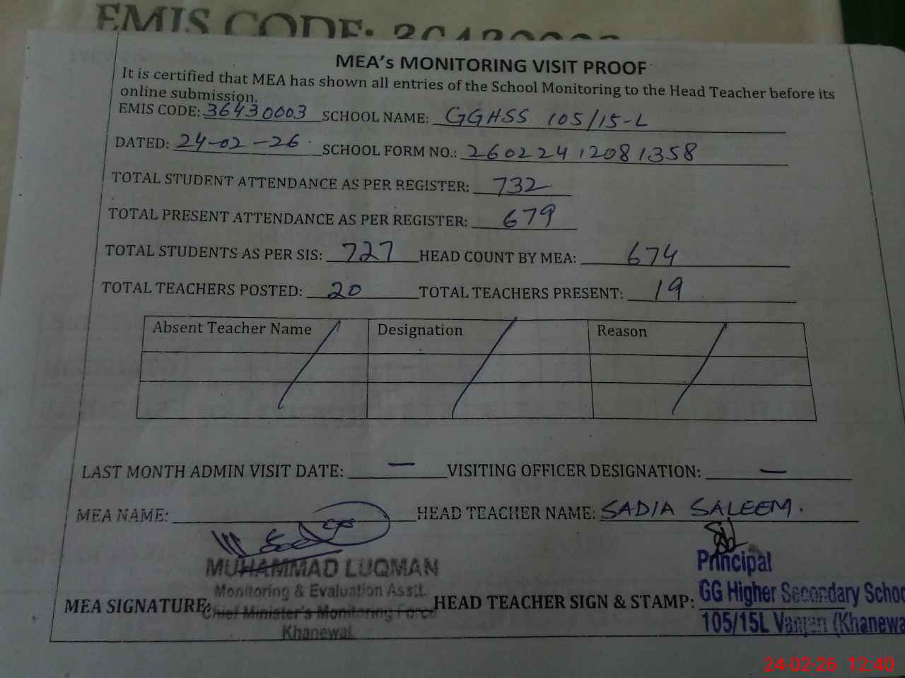 | EMIS Code: 36430003 | Name of School: GGHSS 105/15-L VANJARI, MIAN CHANNU | |||