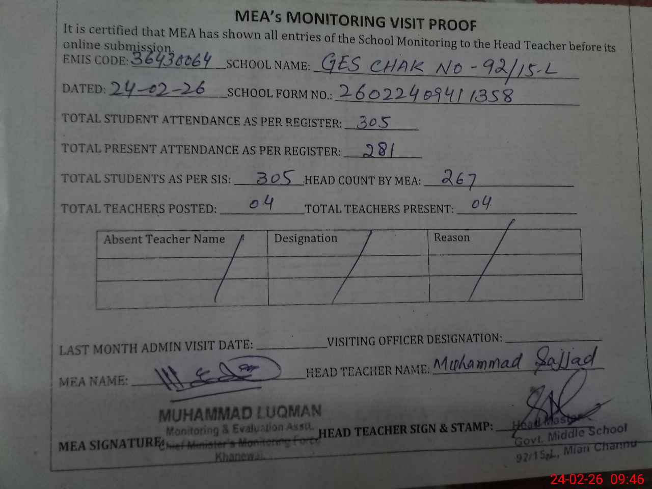 | Attendance Register | Head Teacher | MEA with School | Visit Proof |