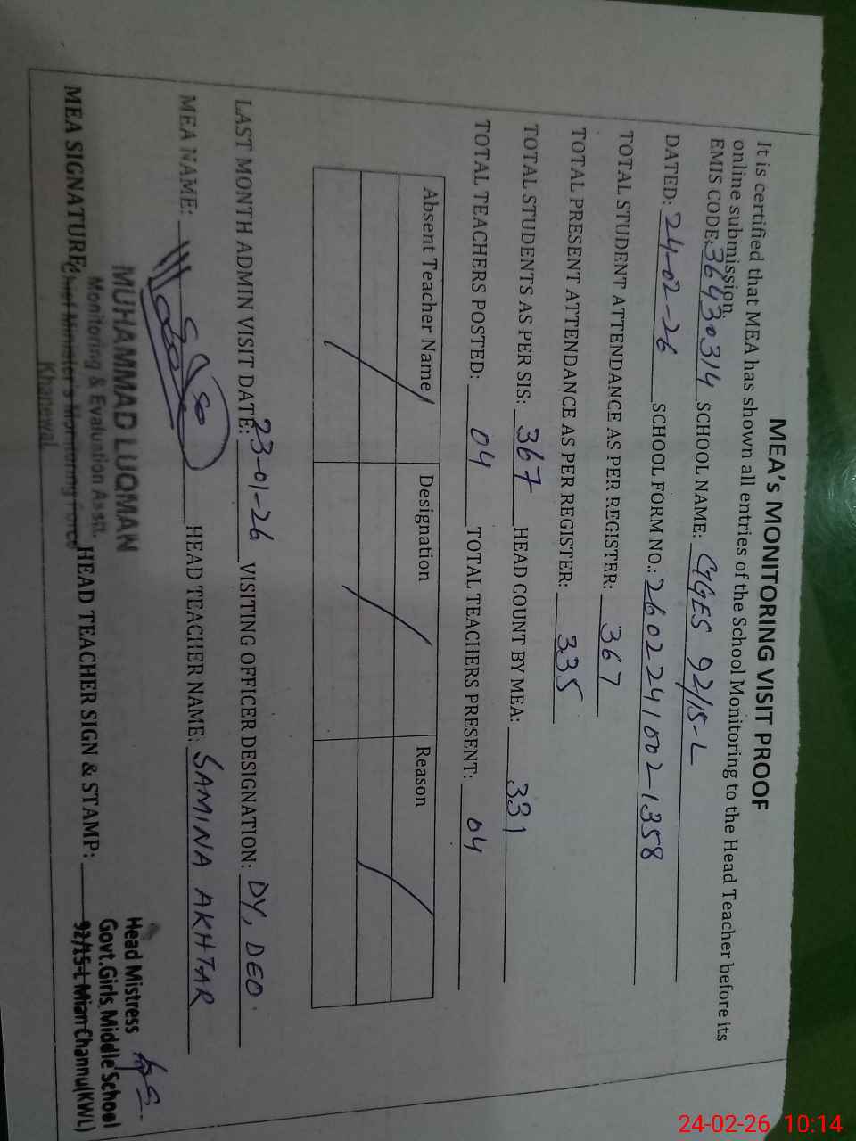 | Certified that this School was Inspected by the Undersigned MEA/DMO Today and the Information Stated Above is as Per Record. | |||||