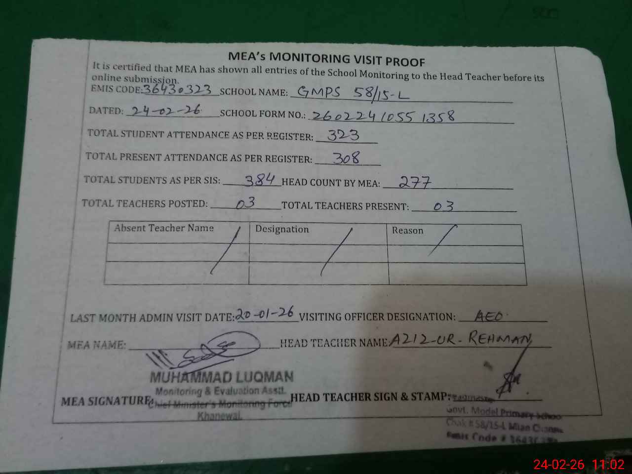 | Attendance Register | Head Teacher | MEA with School | Visit Proof |