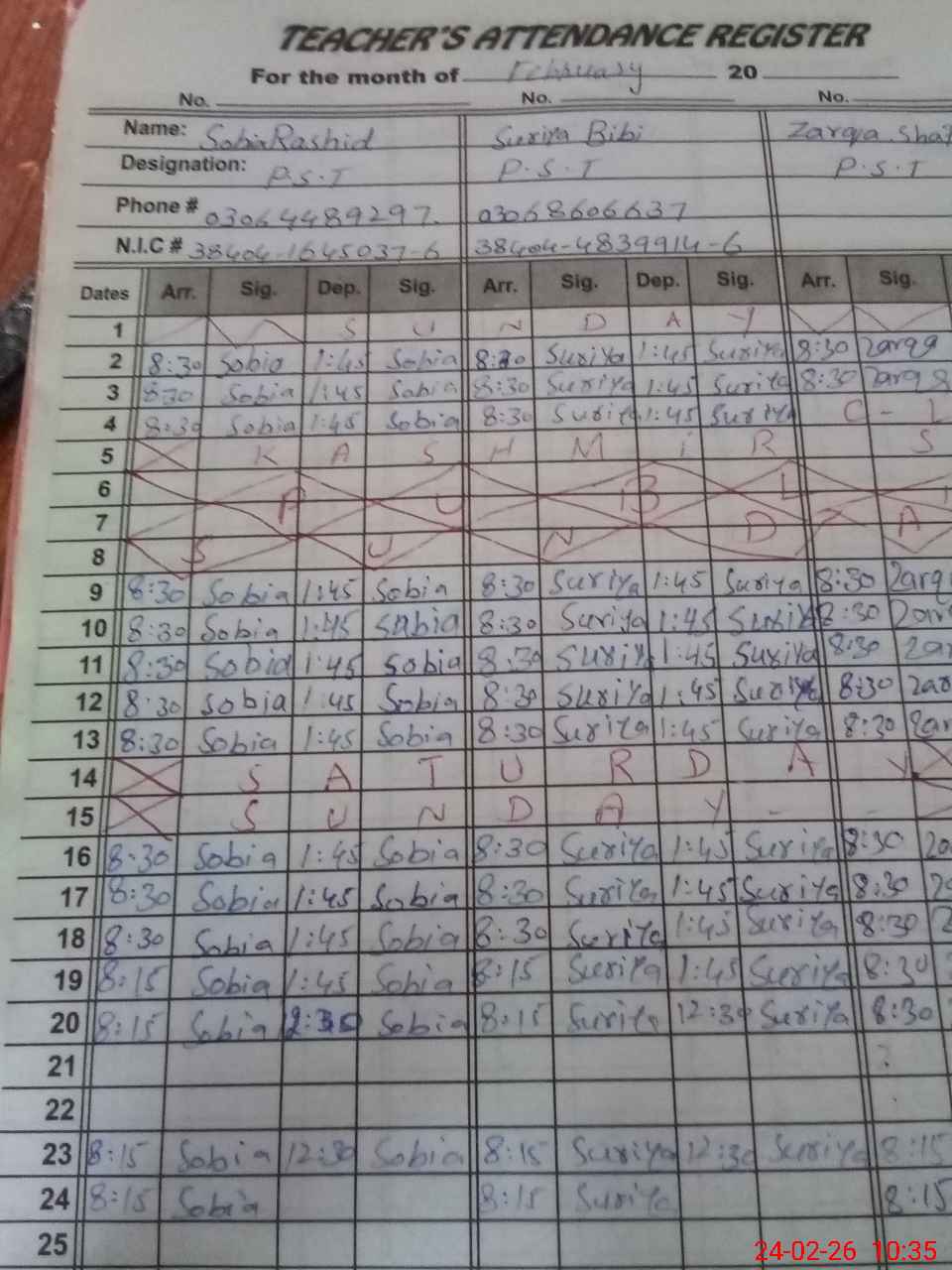 | CNIC | Full Name | Designation | R/C | Absence During Last Calender Month |