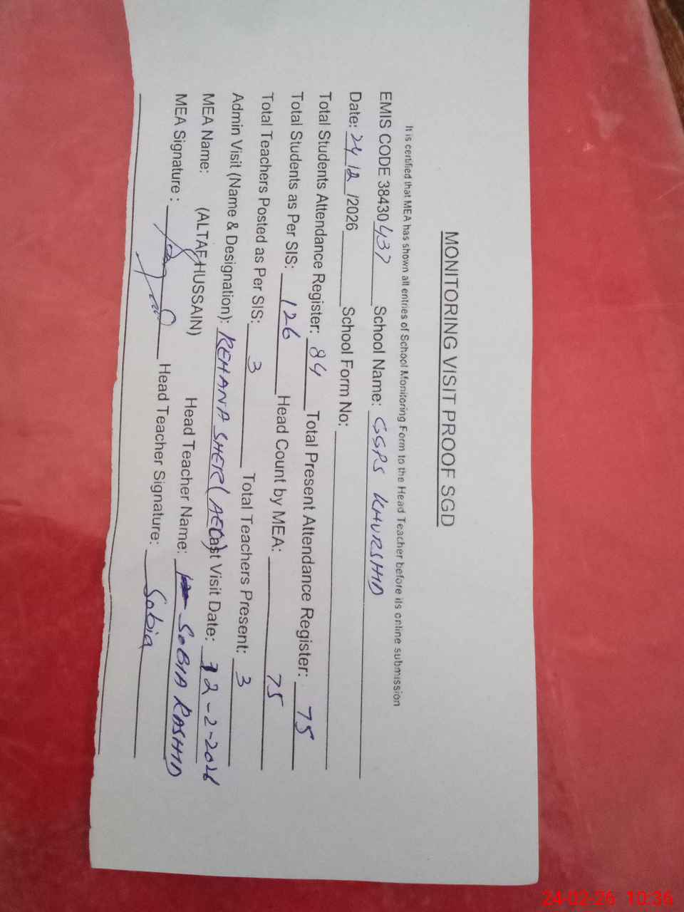 | Attendance Register | Head Teacher | MEA with School | Visit Proof |