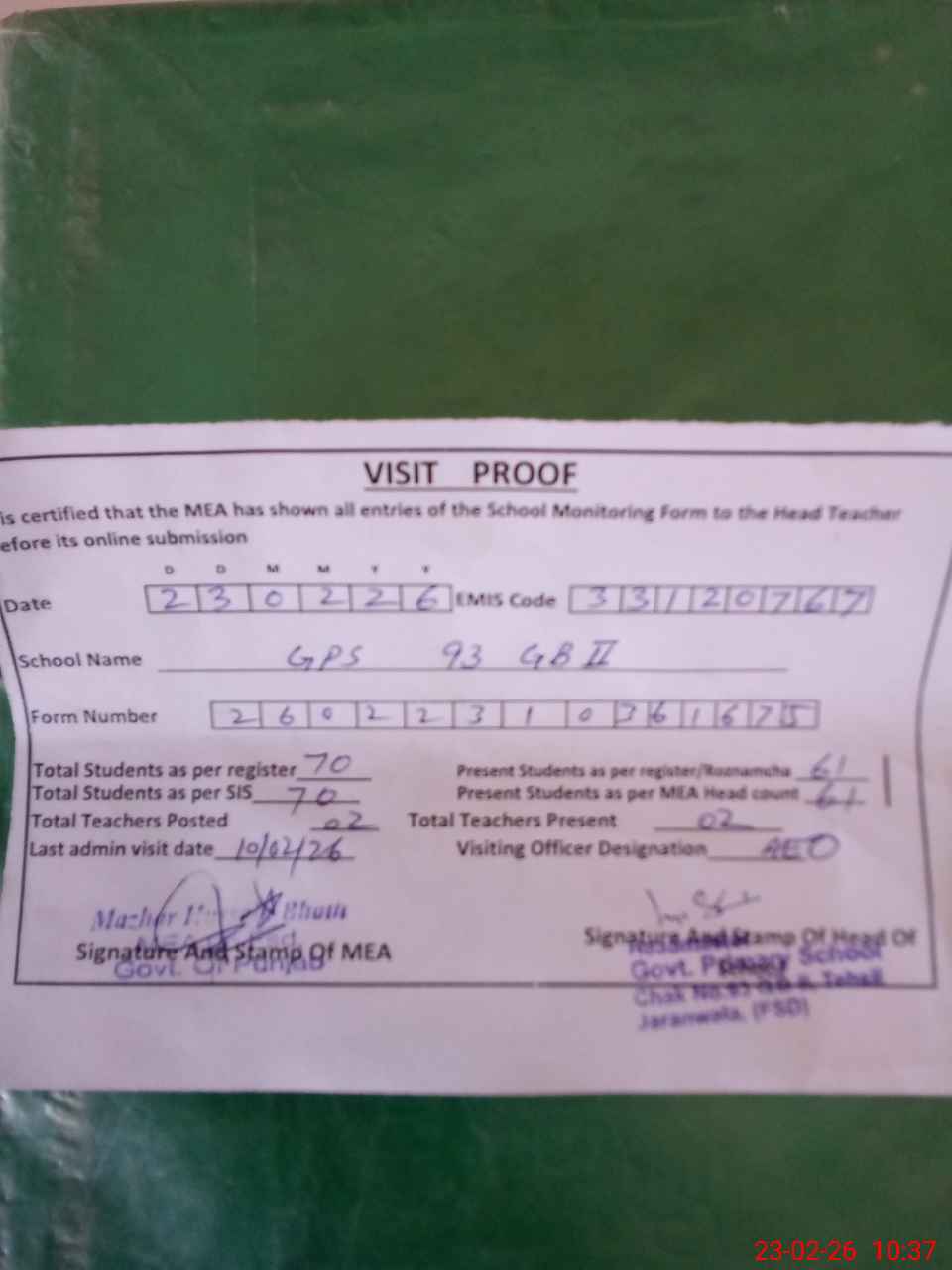 | Attendance Register | Head Teacher | MEA with School | Visit Proof |