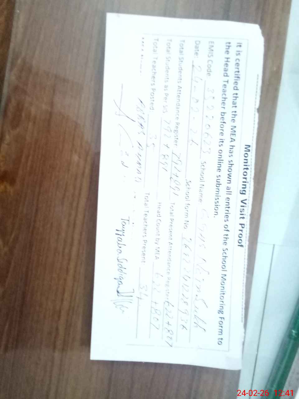 | Attendance Register | Head Teacher | MEA with School | Visit Proof |