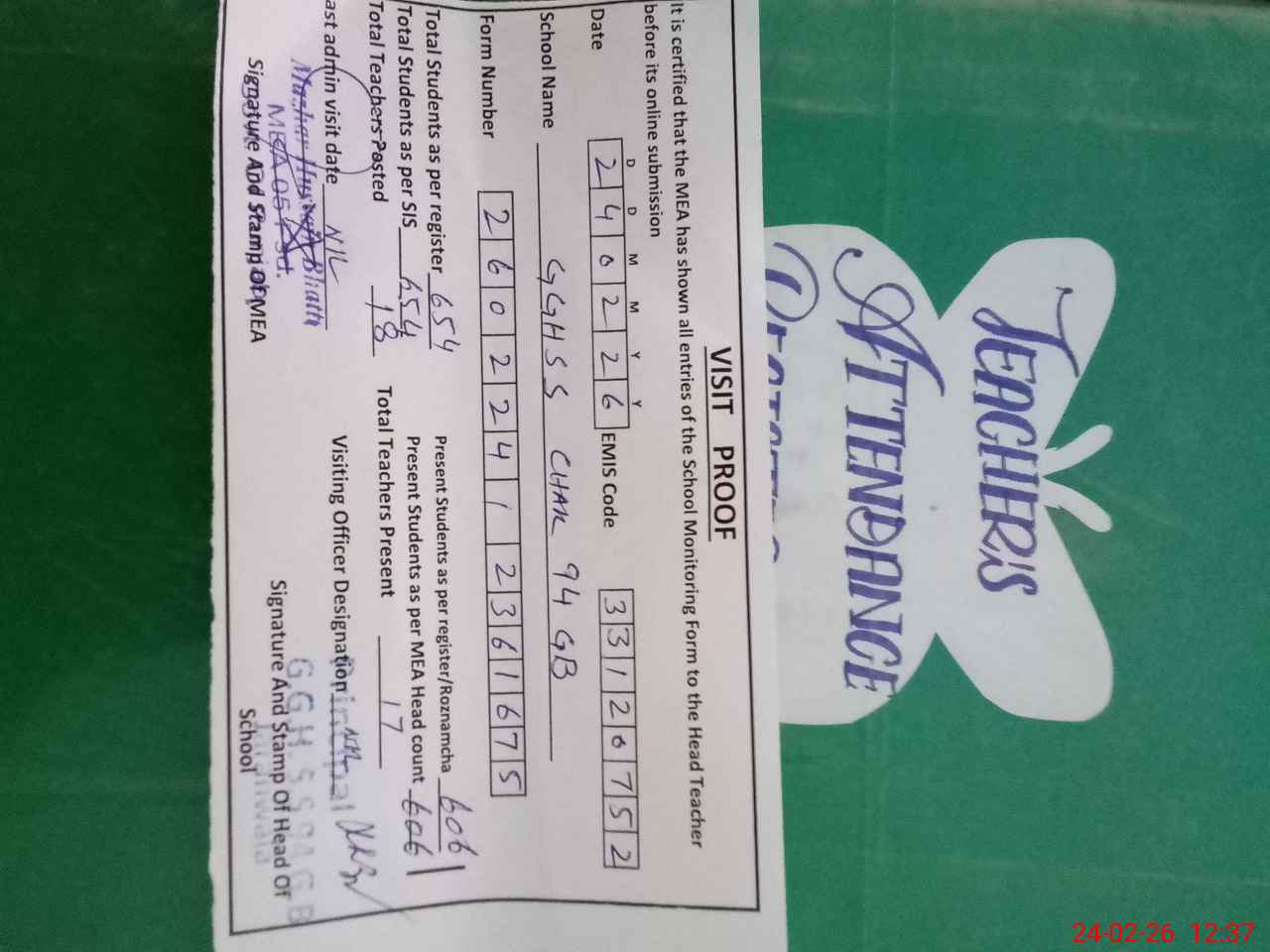 | Attendance Register | Head Teacher | MEA with School | Visit Proof |