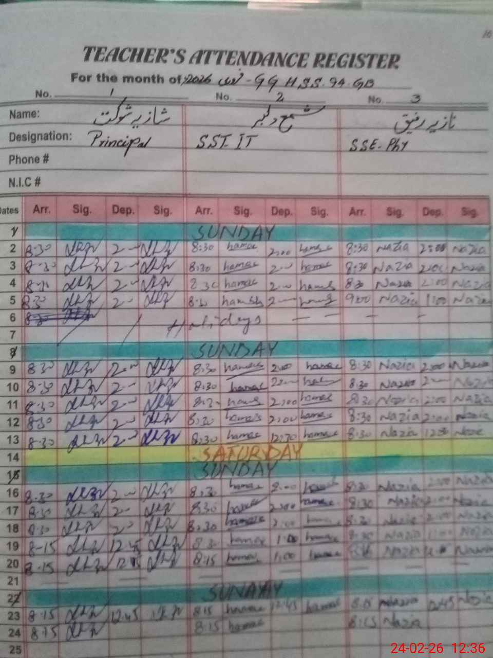 | CNIC | Full Name | Designation | R/C | Absence during last cal. month |