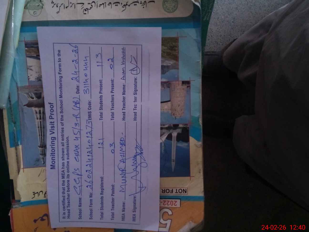 | Attendance Register | Head Teacher | MEA with School | Visit Proof |