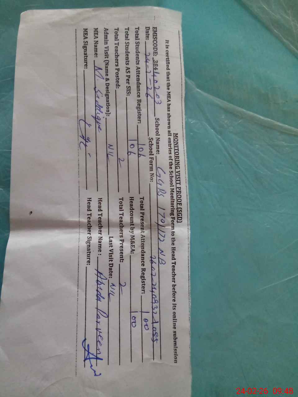 | Attendance Register | Head Teacher | MEA with School | Visit Proof |