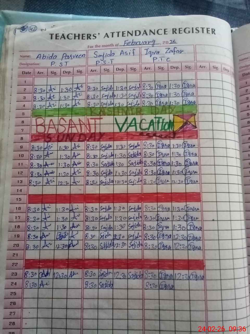 | CNIC | Full Name | Designation | R/C | Absence During Last Calender Month |