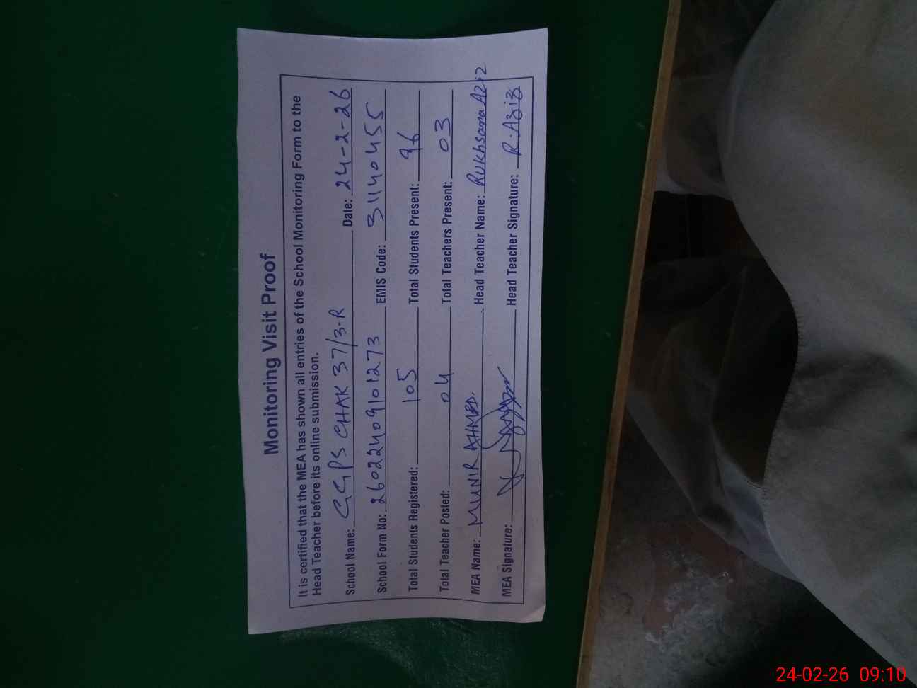 | Attendance Register | Head Teacher | MEA with School | Visit Proof |