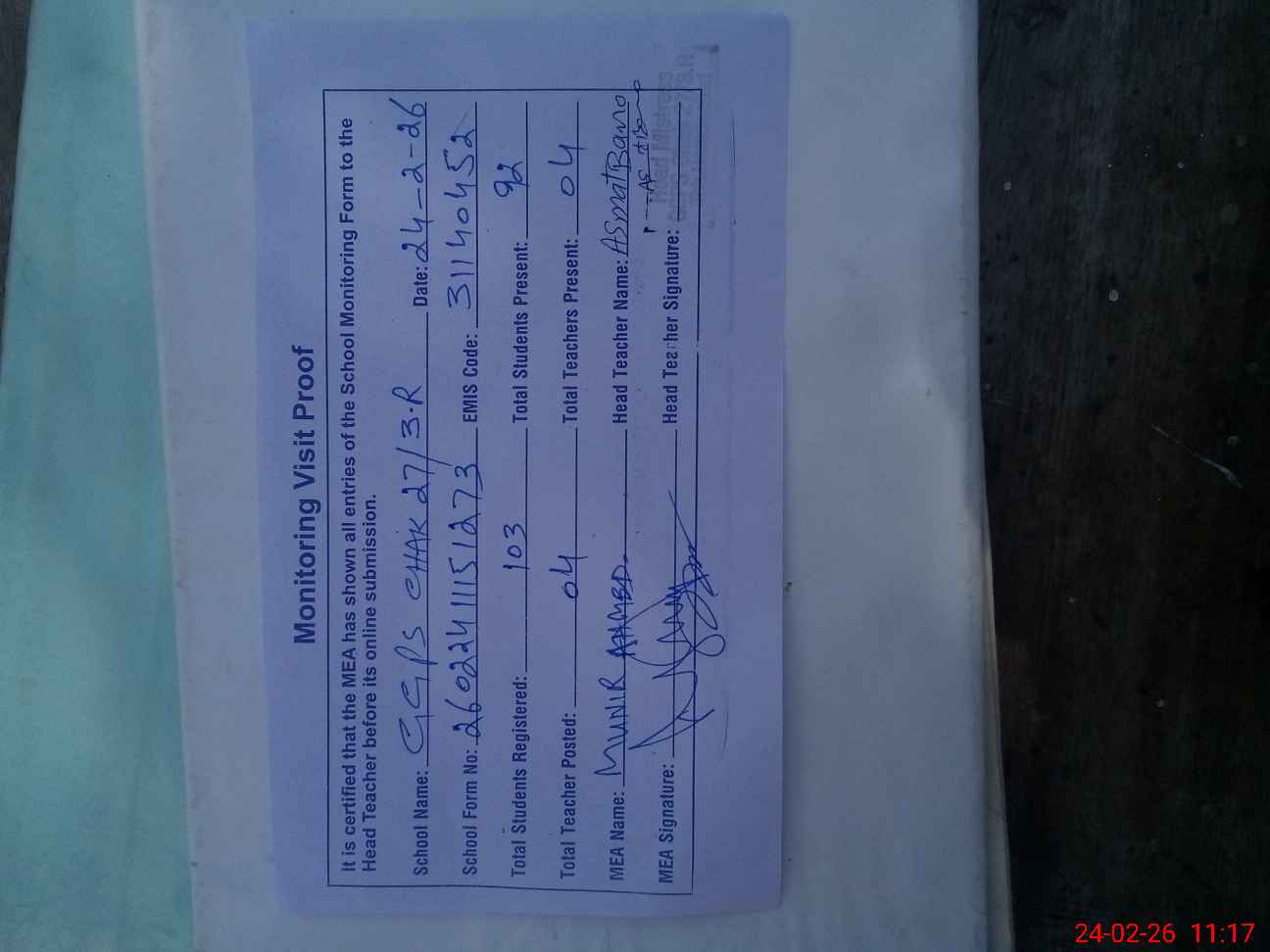 | Attendance Register | Head Teacher | MEA with School | Visit Proof |