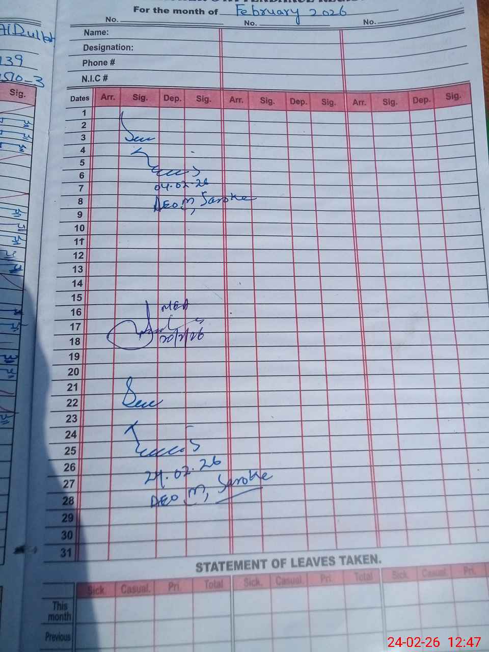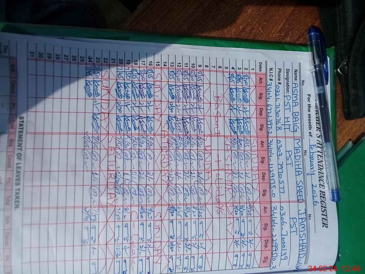 | CNIC | Full Name | Designation | R/C | Absence During Last Calender Month |