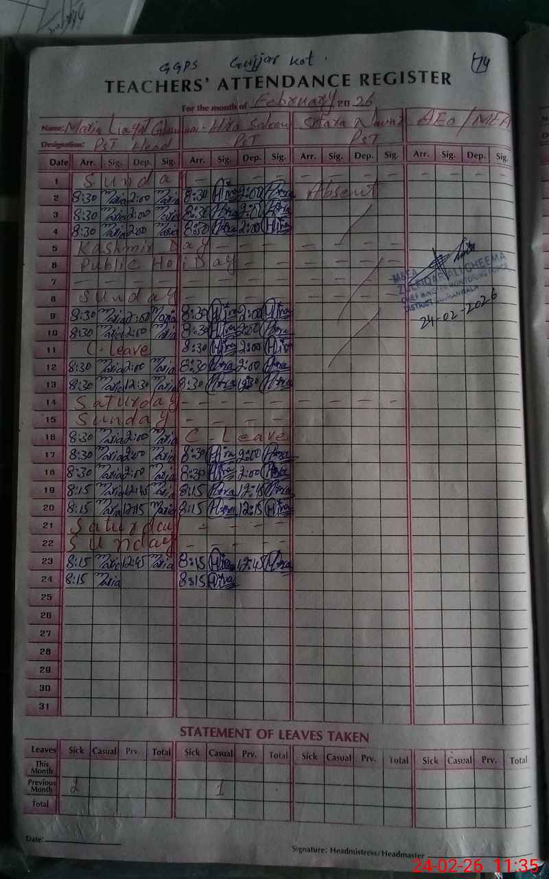 | 34**** | Si**** Na**** | PST Science/Maths | Regular | 0 | 0 | 0 | 0 | 0 | 0 | 0 | 0 | 0 | Absent (Un-Authorized) |