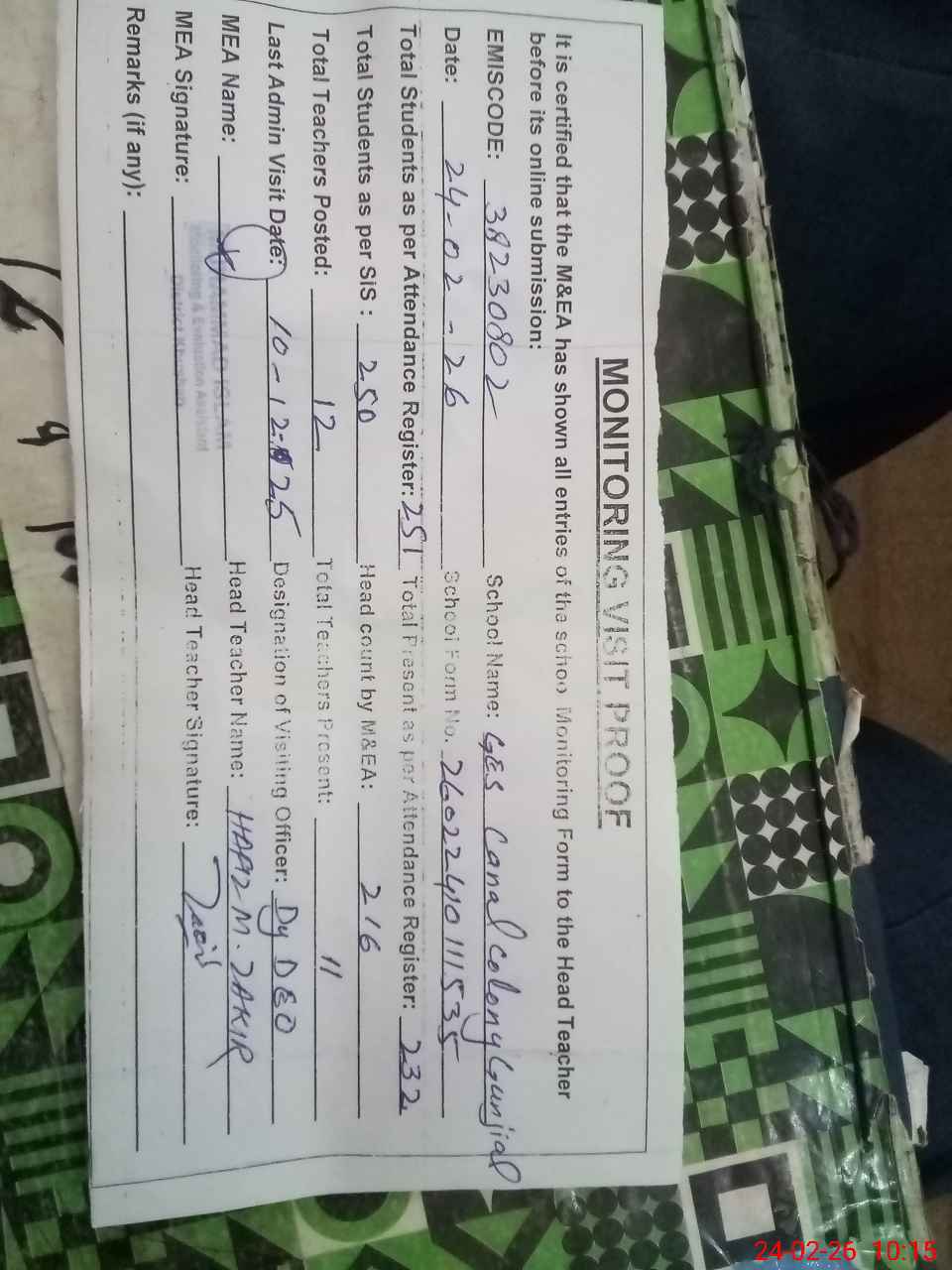 | Remarks (Use Separate Page if Required): Dy DEO visited school on 24 December 2025 students strength on sis 250 | |||||