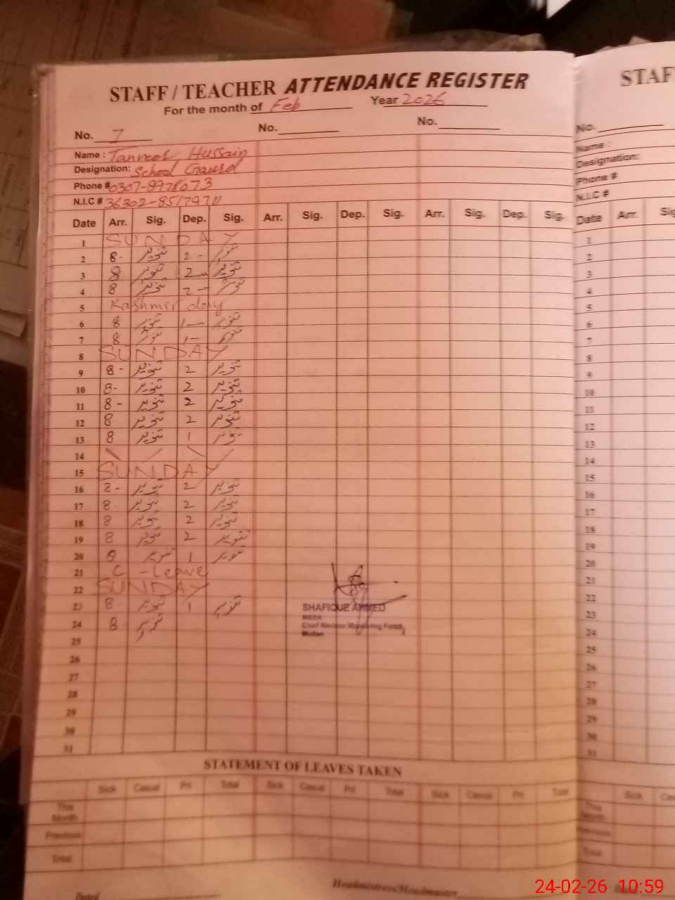 | CNIC | Full Name | Designation | R/C | Absence During Last Calender Month |