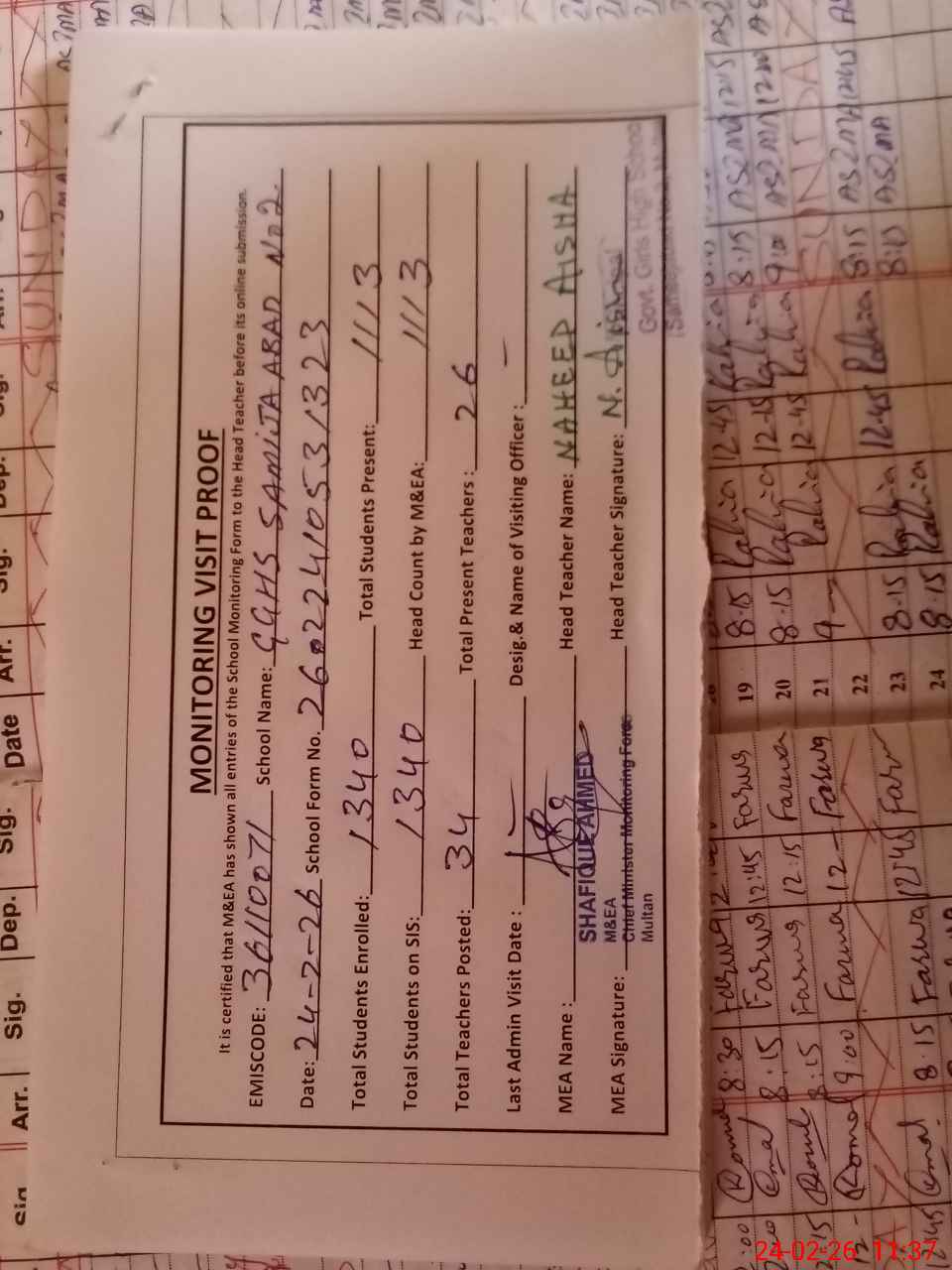 | Monitoring Date: 24-02-2026 | Start Time: 24-02-2026 10:53 AM | End Time: 24-02-2026 11:37 AM | Name of MEA: SH**** AH**** | |