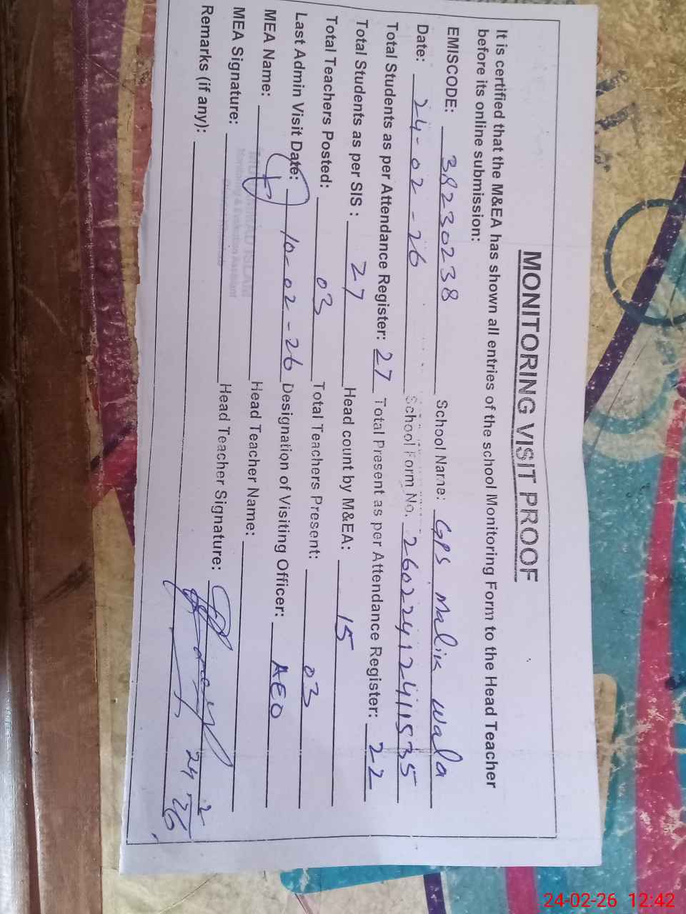 | Remarks (Use Separate Page if Required): AEO visited school on 10 February 2026 students strength on sis 27 3 government teachers for 27 students | |||||