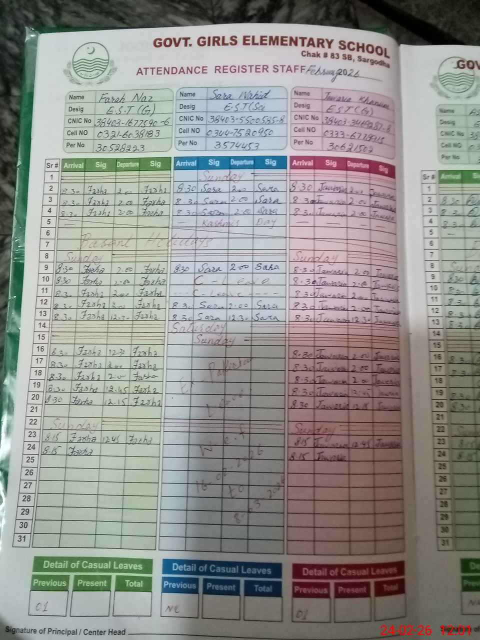 | CNIC | Full Name | Designation | R/C | Absence During Last Calender Month |