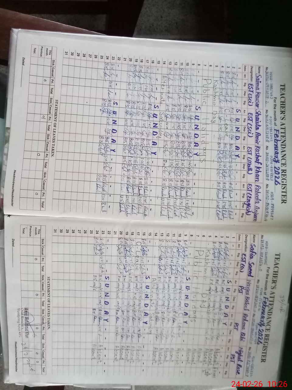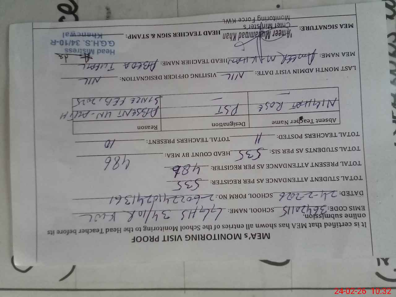 | Remarks (Use Separate Page if Required): Attendance list of 10th class given on MEA tab matching with school SIS as well as class register One PST teacher NIGHAT ROSE Absent Un Authorized since February 2025 till date No official Visit in previous month | |||||